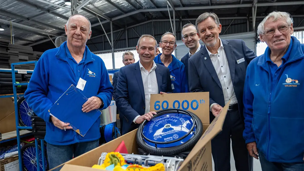On 14 June 2024, Wheelchairs For Kids Australia celebrated a monumental achievement, the production of the 60,000th wheelchair. WA. Premier Roger Cook MLA attended the celebration, alongside Tracey Roberts MP, Margaret Quirk MLA, WFKA Patron Graham Edwards AM, as well as valued volunteers, members of Scarborough Rotary Club, suppliers, partners and friends of WFKA.
